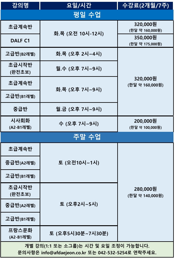 수업에 관한 상담은 info@afdaejeon.co.kr 또는 카카오채널 (대전알리앙스)로 연락주시기 바랍니다.